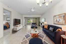 Spacious, sun-filled unit with an open living and dining area perfect for relaxing or entertaining. This bright and airy home features beautiful stone tile flooring throughout, Each bedroom offers the privacy of its own en-suite bath. Granite countertops and a newer A/C add comfort and style, and a service contract provides added reassurance with in-unit washer/dryer combo. Storm shutters for peace of mind. Enjoy resort-style living in a beautifully landscaped, gated community offering an abundance of amenities: clubhouse, pools, tennis, pickleball, bocce, shuffleboard, billiards, and more. Take morning walks among friendly neighbors or stroll over to the clubhouse, just a short walk away. Conveniently located near downtown Atlantic Avenue, pristine beaches, shopping and highways.