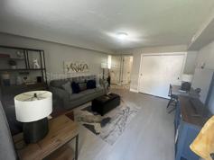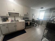 Inside, you’ll find a thoughtfully designed living space featuring modern finishes, neutral tones, and abundant natural light. The fully equipped kitchen includes updated cabinetry, stainless steel appliances, and ample counter space—ideal for both quick meals and longer stays. The cozy living area is tastefully furnished and perfect for relaxing after a day exploring downtown.