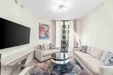 Welcome to luxury living in the heart of downtown West Palm Beach, directly across from One Flagler office tower. This light-filled all new fully-furnished 2-bedroom, 2-bathroom condo boasts a wraparound balcony with water feature & garden views. Featuring tile and bamboo hardwood flooring throughout, condo has just been freshly painted, updated with all new lighting fixtures and refinished hardwood in the bedrooms. The master suite offers a spacious retreat with a king-size bed, large walk-in closet and a bathroom complete with a luxurious soaking tub. The second bedroom, perfect for guests or used as a flex room/office, includes its own private balcony entrance. Queen-sized sofa bed and desk offer the perfect flex space. The residence comes with premium garage parking space. Perfectly