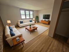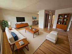 Welcome to 2725 Central Street, located two miles from downtown Evanston, IL. This Mid Century Modern one bedroom, one bathroom apartment with exposed brick is perfect for those seeking a comfortable living space. Step into a bright, open-concept living room that seamlessly flows into a dining room or a home office. Attached is a kitchen featuring ample counter space, and generous storage, ideal for entertaining guests or enjoying quiet nights in.