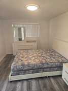 1/1 remodeled Studio/efficiency with private entrance (side of the house) and relaxing outdoor sitting area outside the door (red platform) to and brand new bed with all utilities included water/electricity/garbage/internet