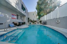 The building features a sparkling pool, secured entry, and convenient on-site laundry. One dedicated parking space is included, and the owner covers water and trash. Co-signers are welcome, and pets are considered.