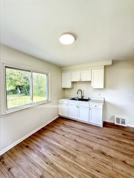The interior boasts a clean, modern aesthetic, highlighted by stylish wood plank floors throughout the main living areas. The modern kitchen comes equipped with a fridge and stove/oven for easy meal preparation.