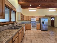 Welcome home to the community of Eldorado of Santa Fe. This spacious three bedroom, two bathroom house is updated and inviting, with high ceilings through the generous living spaces. The vigas on the wooden ceilings create a charming New Mexico feel as soon as you walk in the doors. The kiva gas fireplace will keep you cozy and warm in the winter, along with in-floor radiant heat. The main bedroom with an ensuite bathroom is separated from the two additional bedrooms and the secondary bathroom. There are closets galore in this home, along with a two car garage with great storage space. The main bedroom has a walk-in closet and a bonus area for flexible use. There is a laundry room with more storage, and all the appliances in the home are updated, with a gas stove in the enormous kitchen, and granite countertops providing ample workspace. The front door and back door invite you outside with roomy and shady portals. The home is on the corner of two residential roads, with native NM plants across the landscape. The adobe-walled backyard features several shady trees and flower gardens, offering space to sit and listen, dream, watch, and breathe peacefully. The home is in a quiet neighborhood where wildlife may roam between homes, and the dark skies give you the gift of stars. Just 15-20 minutes from Santa Fe, this peaceful and comfortable retreat has a lot to offer.