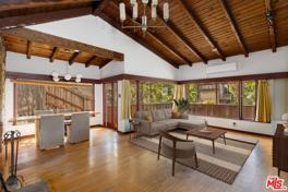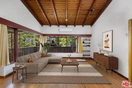Tucked away just off Mulholland Drive, 6933 Vanland Trail is a character-rich hillside home with views out to the valley, mountains, and Hollywood sign offering the rare feeling of a secluded retreat while being moments from Studio City, the Hollywood Bowl, and the 101 freeway. Built by Kelsey Cook the storied "Sheriff of Hollywood" this unique property is one of only two homes he constructed on this peaceful trail, each filled with distinctive architectural charm and thoughtful use of space. Accessed via a stairway path, the property spans two levels: a 2-bedroom, 1-bathroom main residence above a full 1-bedroom, 1-bathroom guest unit below, complete with its own living room, kitchenette, loft, patio, work-from-home living, or hosting guests. Inside the main residence, you'll find vaulted wood-beam ceilings, large picture windows, and a floor-to-ceiling custom stone wall with a wood burning fireplace that anchors the living room. A wraparound deck extends the living space outdoors, offering treetop views and room for entertaining. The kitchen preserves its original cabinetry and includes a classic O'Keefe & Merritt stove a nod to the home's timeless design. The lower unit features a newly renovated bathroom, a freestanding soaking tub on the deck, and a mini-split system in the bedroom for year-round comfort. Several outdoor entertaining areas are thoughtfully layered across the property, taking full advantage of the deep lot and surrounding natural beauty. A one-of-a-kind residence with rich character, and true versatility all in a quiet canyon setting just minutes from the pulse of LA.