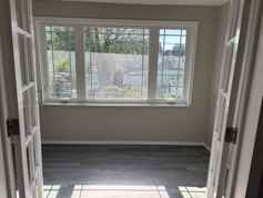 Large living area with with new flooring and double french doors that lead to a bright all season sunroom or it can be used as an extra bedroom.