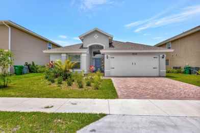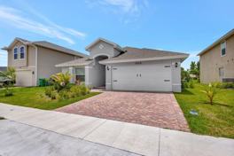 This charming 3-bedroom, 2-bath home offers a spacious open floor plan with vaulted ceilings and an inviting covered lanai. The main living areas feature 18'' ceramic tile, while the bedrooms are comfortably carpeted. The open-concept kitchen is equipped with stainless steel appliances, granite countertops, a pantry, and overlooks both the great room and dining area, making it the heart of the home. The beautifully designed master suite boasts a tray ceiling, dual oversized walk-in closets, and a luxurious master bath with a double vanity, soaking tub, walk-in shower, and a linen closet. Both bathrooms feature tiled showers and cultured marble vanities.