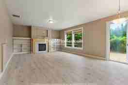 -Light-filled open-concept living with built-in shelving and gas fireplace