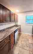 • Modern kitchen with granite countertops, stainless steel appliances, and tile flooring