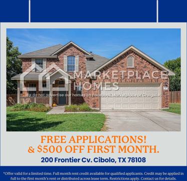 200 Frontier Cv is a 4 bedroom, 2 bathrooms apartment for rent. It is located in Cibolo. It has apartment amenities including outdoor space, and carpet. Cats and dogs are allowed, making it a pet-friendly apartment.