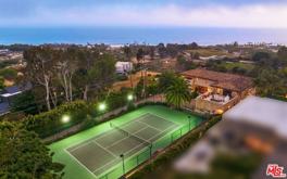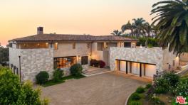 Tucked beyond a long, gated gravel driveway and nestled on nearly two private acres, this masterfully rebuilt estate offers an unmatched blend of refined craftsmanship and timeless design. Reimagined after 2018 with a commitment to non-toxic materials and natural finishes, the home is wrapped in imported stone sourced from an 850-year-old French chateau and features handcrafted doors from Arizona. Throughout the property, warm travertine and French oak floors meet artisan details like river bronze finishes and old-world character. Powered by a solar panel system and equipped with central heating and radiant warm board flooring, this residence is as sustainable as it is elegant. The front yard welcomes with manicured hedges, a peaceful fountain, and an expansive lawn. A grand wooden door opens to the main living area with soaring wood-beamed ceilings, a brick fireplace, and walls of glass-and-metal French doors framing panoramic ocean views. The open floor plan flows into the dining room, where double-height ceilings and a statement chandelier overlook the ocean-facing deck. The kitchen blends functionality and beauty with marble countertops, gold accents, and a large center island. Premium appliances include dual Cove dishwashers, Sub-Zero refrigeration, Wolf steam and microwave ovens, a six-burner cooktop with hood, and dual sinks one with a view of the ocean. A hidden bar with wine fridge complements the space, while a butler's pantry provides additional marble counter space, wine storage, and access to the backyard. The ocean-view deck spans the length of the home, with covered dining, a fire pit, and sweeping coastal views. Below, a flagstone terrace surrounds a sleek rectangular pool with a dramatic waterfall, framed by fruit trees and grassy lawns. The pool house includes built-in bar seating, a mini fridge, and barbecue station perfect for entertaining. Inside, an elevator connects all three levels. A hallway leads to a powder room with imported French tiles and a bonus room ideal for a projector theater. A three-car garage sits adjacent, while the lower level features a 2,000-bottle wine cellar with cigar storage, a second powder room, and a stone-tiled gym. The elevator's mechanical room and tankless heating system round out this level.Upstairs, the guest bedroom opens to a spacious ocean-view deck and features a steam shower, bidet, and generous closet. Additional bedrooms include covered balconies, built-ins, and a shared bath with double vanities. A dedicated laundry room is equipped with Electrolux machines and ample storage. An elevated office overlooks the living room, offering custom shelving, vaulted beamed ceilings, and unobstructed ocean views. The primary suite is a true sanctuary with high vaulted ceilings, a fireplace, French doors to a private balcony, and whitewater views. The ensuite bath includes a freestanding tub, double vanities, and a double-entry shower wrapped in rare stone. Two large dressing rooms complete the suite.Outside, enjoy citrus trees, a tennis court with lighting, lush gardens, hiking trails, and the calming sound of ocean waves. Offered fully furnished, this coastal retreat blends luxury living with mindful design.