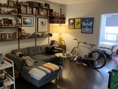 Modern large kitchen with stainless steel appliances including dishwasher. High ceilings and large bright window in bedroom. Bright airy living space with in-suite laundry and window AC.