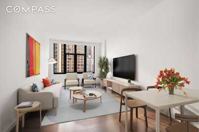 Welcome home to this beautifully modern, bright, and spacious 1 bedroom, 1 bathroom apartment graced with modern finishes, including W/D, central AC and motorized shades, all found in a luxurious, 24/7 doorman condo building in prime Murray Hill. This pristine home is conveniently located with Grand Central Terminal, Bryant Park, and Koreatown all nearby. You are greeted at the entrance by an open-concept living room, dining area, and kitchen with plenty of light with its open eastern exposure. Dark hardwood floors complement oversized double-paned windows and features include Lutron motorized shades and central A/C. The high-end kitchen is adorned with a waterfall, eat-in breakfast bar, sleek granite countertops, vented hood, garbage disposal, and a suite of top of the line appliances including a Subzero refrigerator/freezer, Wolf gas range/oven, Bosch dishwasher, wine refrigerator and drawer microwave. The bedroom is spacious and bright with a walk-in closet and easy access to an immaculate full bathroom with radiant heated terrazzo floors imported from Italy, marble tile walls, a Miton Cucine vanity and medicine cabinet, an oversized sink basin with a wall-mounted Atrio Grohe faucet, and a walk-in thermostatic shower with rainfall and handheld showerheads from Grohe. In-unit Bosch W/D for all your laundry needs. The Lindley is a full-service boutique condominium in vibrant Murray Hill. The building has 24-hour door attendants, an on-site resident manager, a state-of-the-art Technogym fitness center, a private lounge with high-speed Wi-Fi, common laundry, private storage, a bicycle room, and a lovely rooftop terrace with a Wolf grill with dining and lounge furniture, and stunning views of the Empire State Building and city skyline. It is moments from a plethora of restaurants, bars, cafes, and shops, a number of parks and greenspaces and it is close to the New York Public Library, Bryant Park, Grand Central Terminal, NYU Medical Center. Nearby transportation options include the 4/5/6/7/S subway lines, MetroNorth and LIRR commuter trains, the East River ferry, the Hamptons Jitney, and the Midtown Tunnel. - Credit check fee for owner: $20 - Condominium building rental application fees: $1,750 - Move in deposit: $1,500 refundable deposit will only be necessary if self-move. If using insured movers, there would be no deposit payable, only a completed COI is required.
