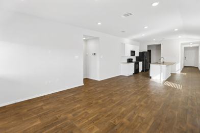 Ready for MOVE-IN! This charming one-story home in the popular Stoney Creek subdivision offers a modern, open layout with wood-look vinyl flooring throughout the living and kitchen areas. The kitchen features crisp white cabinets, a center island, and black appliances, including a refrigerator. The spacious living room is filled with recessed lighting, creating a bright and welcoming space. The master suite boasts high ceilings, recessed lighting, a single vanity, a large walk-in shower, and an oversized walk-in closet. Step outside to a covered patio with privacy fencing—perfect for relaxing or entertaining. Conveniently located near Lackland Air Force Base, major highways, shopping, and dining.
