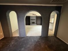 Two living areas with arched brick accents and a ceiling fan