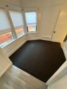 A cozy and bright interior that features carpeted and hardwood flooring, large windows with blinds, built-in bookshelves, and cabinets. Its lovely kitchen is equipped with smooth countertops, fine cabinetry, refrigerator, range/oven, and garbage disposal.