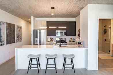 The apartment has floor-to-ceiling windows, walk-in closets, in-unit laundry, waterfall-edge white quartz countertops, and an exposed architectural concrete ceiling. The building has a pool, co-working spaces and fitness studio.