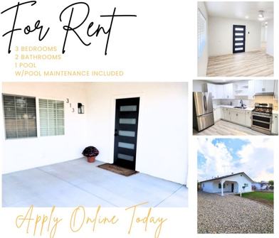 Welcome to the most beautiful house on the block...313 Magnolia Ave. This recently renovated home is a 3 bedroom, 2 bathroom house with a POOL! Amenities included: spacious bedrooms and closets, brand new AC unit for the valley heat, stainless steel appliances, brand new kitchen, beautiful bathrooms, spacious and gated front and back yards. Located in a very quiet and friendly neighborhood. Bonus: renovated children's park just a block over. Target, Starbucks, Walmart and Costco less than 3 miles away! Pool maintenance monthly included. Date Available NOW! $2,350/month rent + $2,350 security deposit required. Please submit the form on this page or contact June Property Solutions, LLC. at 442-225-0455 to learn more. This property is managed by a responsible landlord using Avail landlord software.