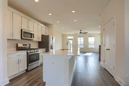 kitchen areas. The kitchen anchors the space with a generous center island, sleek finishes, gas cooking, and