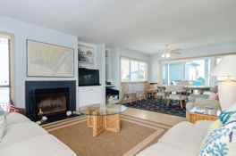 As you arrive, you’ll be greeted by the coastal charm of this well-maintained home. Head upstairs to the main living level, where an open-concept layout seamlessly connects the kitchen, dining, and living areas—ideal for spending quality time together. The kitchen is fully equipped for everything from casual breakfasts at the island to family-style dinners at the large dining table. After a satisfying meal, step out onto the deck to feel the ocean breeze and watch the sky turn pastel as the sun sets. This level also features a comfortable queen guest room with convenient access to a nearby full bathroom—perfect for guests who prefer to avoid stairs during their stay.