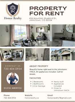 Charming 2 bed, 3 bath townhouse in Johnstown, CO. Built in 2023, this modern home features updated appliances, central heating, garage, and on-site laundry. Pet-friendly for cats and dogs. Rent: $2500/month including garbage and sewage. Available 9/1/2025 or sooner. Call for details.