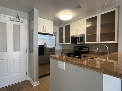 Must see to appreciate this sharp and modern 3rd floor condo featuring 1 bedroom with walk in closet and a full bathroom and stacked laundry machines. This upgraded unit features urban appeal with faux wood plank flooring. Kitchen includes stainless steel appliances with granite countertops. Additionally, the condo offers central AC. Community features a secured entry with parking garage (1 space) and access to fitness center.