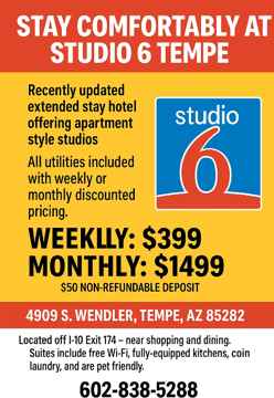 Studio 6 Tempe is located just off I-10 at Baseline, near Arizona State University, Diablo Stadium, AMC Ahwatukee, shopping and dining. Suites include Free Wi-Fi, fully-equipped kitchens, coin laundry, pet friendly.