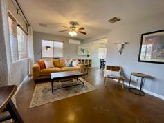 Stylish 2-bedroom single-family home. Fully furnished and move-in ready with modern acid-stained floors for easy cleanup. Spacious kitchen with everything you need for cooking and meal prep. Opens to dining area and covered patio with gas BBQ.