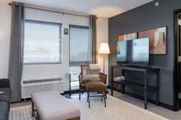The apartment features a cozy living area complete with a comfortable sofa, coffee table, and Tv. The bedroom includes king-size bed, a writing desk, and a spacious closet for easy organization. A well-equipped kitchen—stocked with essential appliances, cookware, and a dining set—makes meal prep simple. The bathroom is clean and contemporary, with all the necessities ready for move-in.
