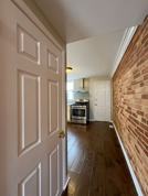 Upon entering, you are welcomed into a warm and open living area featuring rich wood flooring, a striking exposed brick wall accent, and ample natural light that highlights the clean, neutral palette throughout. The adjacent kitchen is well appointed with wood flooring, tiled backsplash, built-in cabinetry, refrigerator, and stove with oven. A convenient exit leads directly to the paved and fully fenced backyard, offering private outdoor space with planters and access to the second-level balcony via exterior stairs.
