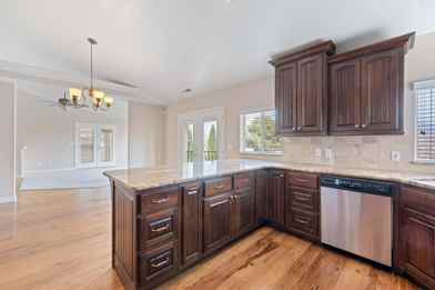 - Magnificent kitchen with spacious granite countertops and designer cherry wood cabinets.