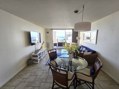 Experience island living in this charming 1-bedroom, 1-bath (1pkg), furnished unit in the heart of Waikiki. Enjoy the comforts of home with a fully equipped kitchen, central ac, washer dryer in the unit, private lanai offering serene city, ocean and Diamond Head views & roof deck amenities. Tub has been remodeled to a walk-in shower stall recently. Building is secured and offers BBQ grills, community pool, exercise room, yoga room and sauna. Includes one unassigned, covered and secured parking spot. 2 blocks from world-famous beaches, shopping, dining, Friday night fireworks nearby and more! Minimum 9-month rental, lease must end by 12/31/2026. Sorry, no pets, no smoking of any kind in the unit or building grounds, and renter's insurance required. Contact agent for more info and showing appointments.