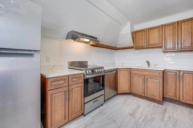 Tastefully designed Kitchen is equipped with bright white subway tile backsplash, brand new oak wood cabinets and tastefully selected Quartz Countertops. Modern and Sleek electric stove top oven, with stainless steel dishwasher and refrigerator. This beautiful and bright unit features high ceilings, and newly installed wood floors. The bedroom is large enough to fit a King size bed, dresser and desk. Three deep closets in the hallway not including the closets in the bedroom and living room making it a total of 5 closets. Combo Washer + Dryer in unit. At walking distance to the light rail at West Side Station. Just steps to NJCU University. Close to Route 440 Hudson Mall ie: Marshalls, Homegoods, Starbucks Home Depot, Acme Supermarket, and much more. On Westside Ave, you will find: University Place Pharmacy, Five Guys Burger, Nail Spa, 7 Heaven Mart, Carvel. Super convenient area.
