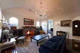 The front porch has since been incorporated into the house, which now boasts matching oak hardwood floors, custom shelving and a row of custom windows commanding the front yard, a perfect space for your library/den. The house invites you into the spacious dining area with a large arched passageway giving way to a custom, 128 raindrop blown glass fixture centered over your dining table. The ample lighting is accented by a large, north facing window and three skylights. Additionally, the family room is perfect for creating lasting memories, complete with a TV, a convenient bar sink, and unique handmade wood cabinets.