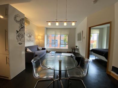 Great furnished condo (3 ½), with a closed bedroom, located in the heart of the Old Montreal, 425 rue Saint-Hélène, only a few steps away from shops and restaurants and 5 minutes away from Square Victoria metro station.