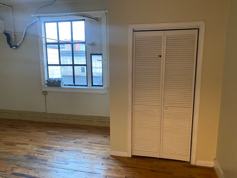 Hardwood floor, high ceiling, closet.