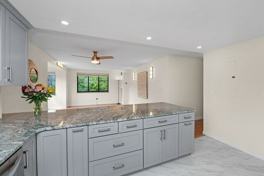 The custom kitchen is a true centerpiece, boasting granite countertops, stainless steel appliances, grey Shaker soft-close cabinets, a 10-foot peninsula, under-mount sink, glass tile backsplash, and recessed lighting.
