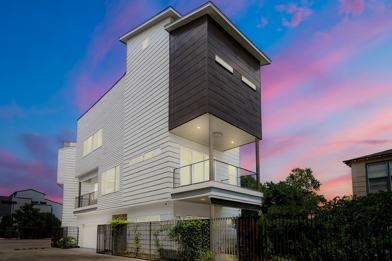 Sleek modern design with a private rooftop terrace! Welcome to this contemporary and light-filled single family home in Eado with an adorable fenced in yard & ample natural light. This four story beauty was a custom build and features a first floor en-suite bedroom with an entrance into the private backyard garden. Second floor is an open-concept floor plan with your modern island kitchen seamlessly flowing into the dining area and living room. The second floor features two covered balconies, perfect for grilling and entertaining. The third floor includes the primary bedroom & spa bath and another en-suite bedroom. The fourth floor is your zen space with a private rooftop terrace and views of the downtown skyline. White oak hardwoods throughout, automatic electric shades throughout 2nd floor, and just one owner. Across the street from Emancipation Park, and close to all of the city's sports venues, fine dining, and easy access to 59 and 288..Fridge/washer/dryer included. Move-in ready.
