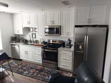 This modern Carriage House combines modern amenities with cozy living. The kitchen is equipped with quartz counters, new cabinets and essential stainless appliances including a dishwasher, refrigerator, stove and microwave, making meal preparation a breeze. Enjoy the convenience of in-unit laundry facilities with a washer and dryer included.