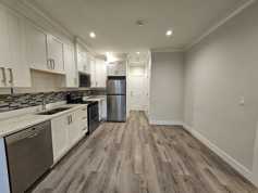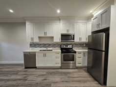 This suite features an open layout with large windows, stylish flooring, and recessed lighting throughout. The kitchen and living area are spacious, with a clean and contemporary design.