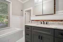 Inside, original hardwood floors add warmth and authenticity, while the open floor plan features new marble countertops and abundant natural light from oversized windows throughout. Both bedrooms include custom closet systems, and the newly renovated primary bathroom offers a spa-like retreat with a frameless glass shower and soaking tub.