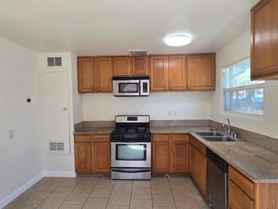 Zero deposit required at move in for qualified applicants through Obligo!! Great location close to the 405fwy, fast food and groceries store. Large 2-bedroom 1 bath unit on the first floor. Large and bright kitchen with granite counter tops, gas stove, microwave-hood and dishwasher. Large dining area with ceiling fan. Spacious and airy living room with new laminate wood floors. 2 large bedrooms with new light fixtures. Full bathroom with a soaking tub and tile floors. 2 parking spaces. One year minimum lease. Good credit and provable income only. Renter's Insurance required.