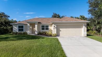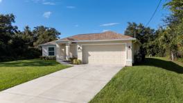 Welcome to this immaculate 3-bedroom, 2-bathroom home in North Port, built in 2022 and designed with modern living in mind. Offering 1,437 square feet of well-planned space on a generous quarter-acre lot, this residence combines style, comfort, and durability. The open, split floor plan features vaulted ceilings and beautiful porcelain tile flooring throughout, creating a bright and inviting atmosphere that is both elegant and easy to maintain.