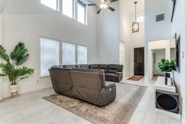 This is a spacious home with 2,786 square feet and a layout that showcases 4 bedrooms, 3.5 bathrooms, a game room, and a 2-car garage. This gem greets you with a light stone exterior and a stunning covered porch. Step inside the stunning 2-story foyer, accentuated with a bronze Finnegan chandelier and light gray tile flooring.