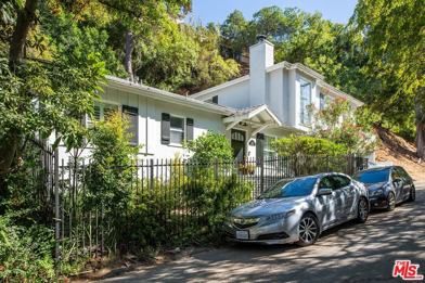 Tucked away on a peaceful and scenic Hollywood Hills Canyon Road, this stunning traditional-style home radiates charm and character. Featuring an open floor plan with vaulted ceilings, a modern kitchen with a breakfast bar, a cozy dining area, a fireplace, hardwood floors, and French doors that lead to a tranquil rear garden with terraced hillside views. The inviting home offers 3 bedrooms, 2 full bathrooms, a den (potential 4th bedroom), and a laundry room. The spacious master suite with soaring ceilings, complete with a luxurious bath with a jetted tub and a private office/flex space, occupies the second floor and opens to a generous wrap-around patio ideal for relaxing in the serene canyon surroundings. Additional highlights include an EV charger, Nest Thermostats, Ring doorbell, new washer/dryer, Culligan saltwater softener, retractable awning off the master, skylights, tankless water heater, storage room, and three private parking spaces - one oversized. Freshly painted, remodeled and located within the Wonderland Avenue Elementary School district, this home is a true oasis! 13-month Term minimum - no exceptions