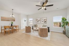 These zero-entry ground-floor-only townhomes feature luxury vinyl planking in the kitchen, living room, laundry room, and bathrooms, with carpet in the bedrooms. The kitchen features granite countertops, a walk-in pantry, and all-new stainless-steel appliances, including a refrigerator, stove, dishwasher, and microwave. There is a separate laundry room with hookups for a washer and dryer. A full bathroom is located off the hallway. The main bedroom features a walk-in closet, a full en-suite bathroom with an easy-access walk-in shower, and a sliding patio door that opens onto a fenced, concrete patio area. A combination of rough iron and wood privacy-fenced yard with new grass and sprinkler system. Access to the community clubhouse, which will include a pickleball court, pool, and playground, is expected to be available in late 2025 or early 2026.