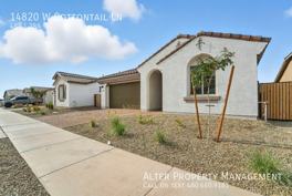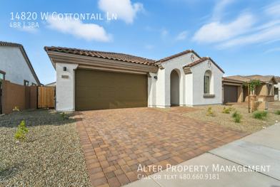 14820 W Cottontail Ln is a 4 bedroom, 3 bathrooms apartment for rent. It is located in Surprise. It has apartment amenities including dishwasher, ceiling fan, walk-in closets, and microwave. Cats and dogs are allowed, making it a pet-friendly apartment.