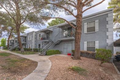 Lovely first floor condo with 2 bedrooms and 2 full bathrooms. All bedrooms and bathrooms are downstairs. Open floor plan. New paint. Bedrooms have large closets and the main bedroom has in suite bathroom. Kitchen appliances are electric stove, microwave, refrigerator, dishwasher. Lovely open patio with sliding glass door. Located in Gated French Oaks community. Great community with pool. Assigned covered parking space and lots of open parking. Located minutes from the Strip, shopping, dining, transportation, and UNLV.