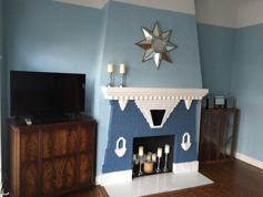 --Den/Living room is complete with original art deco fireplace, TV w/DVD, end tables, and a big beautiful, high quality sofa that pulls out into the most comfortable queen bed. It is an American Leather Comfort Sleeper that retails for $4,000. It is seriously one of the most highly rated and comfortable sofa sleepers on the market. We have beautiful silver curtains partition off the living room for privacy. 3 large arched windows. Classic and original details like curved ceilings and rounded archways.