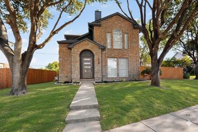 Step into this beautifully updated two-story residence, where modern design meets comfortable living. The home's stunning curb appeal, with its classic brick facade and manicured front yard, sets a welcoming tone. Inside, the bright, open floor plan features durable wood-look flooring throughout the main living areas, which are illuminated by an abundance of natural light from large windows. A stylishly updated kitchen boasts white cabinetry, sleek countertops, a subway tile backsplash, and modern appliances, including a striking blue dishwasher. The living room is anchored by a contemporary fireplace with a stone surround and a rustic wood mantel, creating a cozy focal point. The downstairs half-bath is a showstopper, featuring a designer accent wall that adds a unique touch. Both full bathrooms have been thoughtfully renovated with chic tile work, including marble-style tiles and a hexagonal mosaic niche. One bathroom features a tub, while the other offers a stand-up shower with a sleek glass enclosure. The home is equipped with updated fixtures, including black ceiling fans and hardware, enhancing its modern aesthetic. This move-in ready home offers a fresh and sophisticated living experience.
